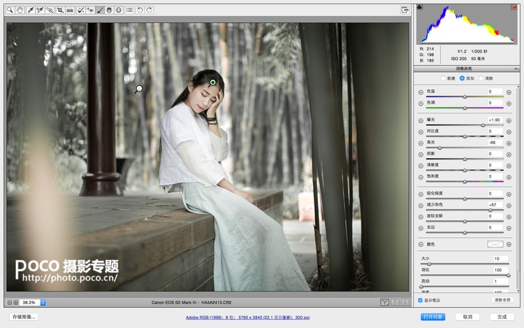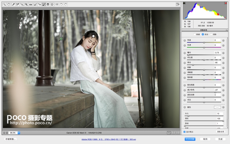 这里我说下笔刷的使用,我主要是用笔刷来处理主体与背景的关系,笔刷1降低背景曝光。笔刷1参数为曝光-3.75,高光-66,减少杂色+67。