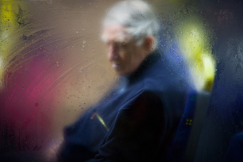 Nick Turpin使用长焦镜头,在远处捕捉到这些充满趣味的场景,那些被拍摄的对象根本不知道自己已然成为了故事的主角,依旧是各行其事,有些人擦开雾气以方便向外眺望、有些则把头贴在窗子上小睡一会儿。男人、女人、老人和孩子的轮廓透过窗上雾气的折射,再加上原本色彩的散射,使得每张作品都带有了一丝绘画的感觉。其实对于街头摄影而言,摄影师的观察力十分重要,街上不同场景和路人的搭配往往会产生十分有趣的画面,善于发现,你也会拍出有意思的好作品。