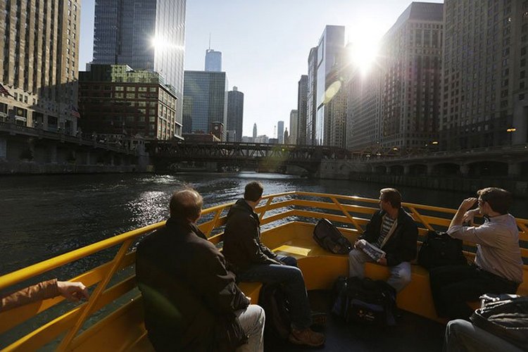 美国芝加哥,乘坐水上出租车从芝加哥河赶往密歇根大道的通勤者。