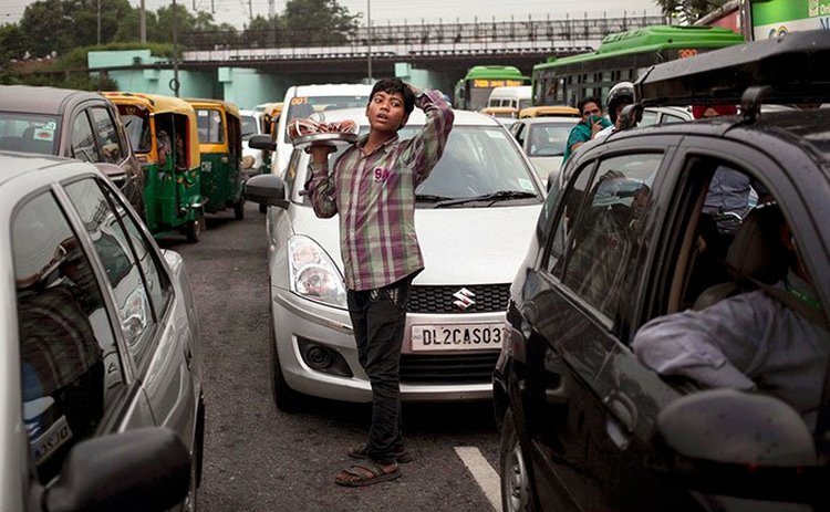 印度新德里。男孩趁着塞车时间,来到了车群当中推销椰子。