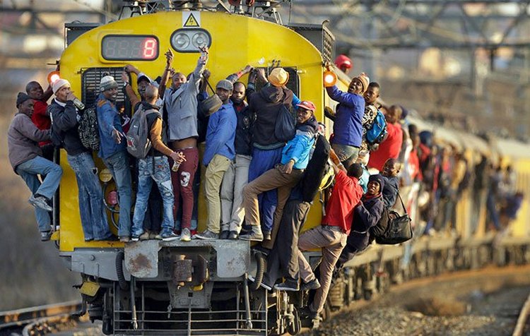 南非索韦托。这里的火车拥挤程度可以见一斑,就连火车外面也“挂”满了乘客。