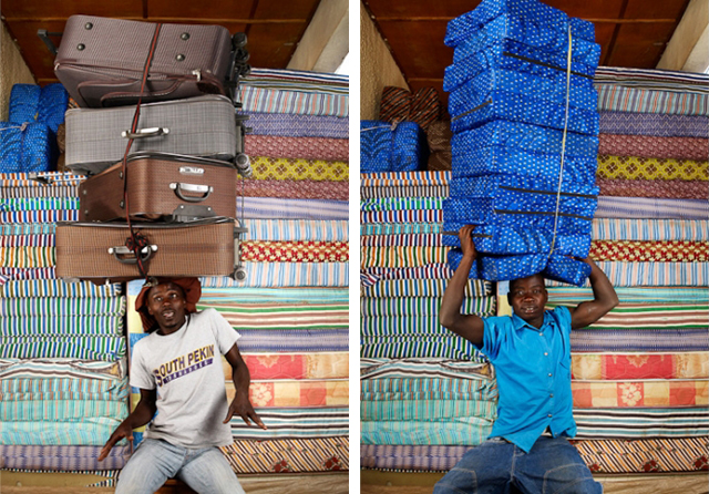 2012年从埃塞俄比亚出发,Floriane的足迹已经遍布4个大洲的7个国家15个地区,拍摄过70位对象,而专题至今仍在进行中。他们所承载的大多都是一些生活必需品或者消费品,有的是几麻袋的粮食,有的是成捆稻草,还有的是一堆的空瓶子。Floriane就这样将生活的重量与人们平衡压力的状态用一种具象化的形式表现出来。