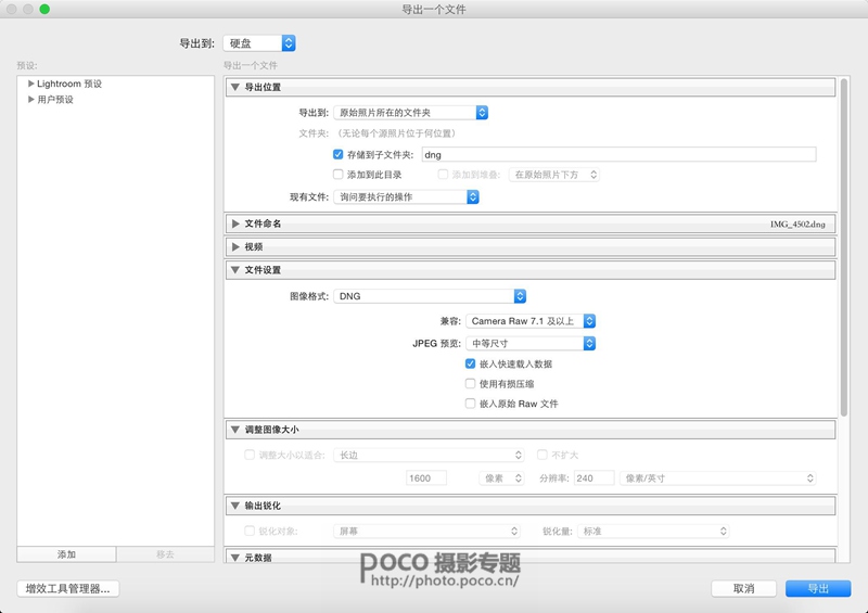 接下来导出照片进入PHOTOSHOP。我这里导出的格式为DNG。DNG为无损压缩,详情请自行百度。