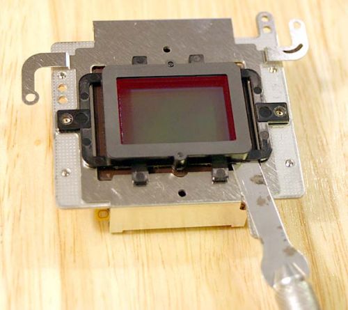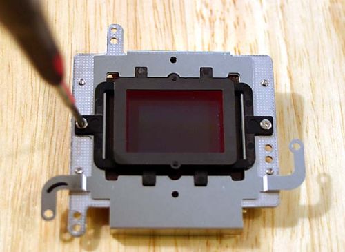 这个黑色的滤镜框除了螺丝之外,还有一层非常薄的双面胶粘在CMOS芯片上。使用一系列刀片,甚至平口小凿子分开滤镜框和双面胶。
