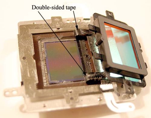 这一步操作非常接近相机的核心——CMOS,因此在操作时要尤其谨慎。推荐使用小刀片沿着双面胶缓缓割开,直到双面胶完全脱离CMOS芯片。尽量保持双面胶完好无损,以备组装时使用。