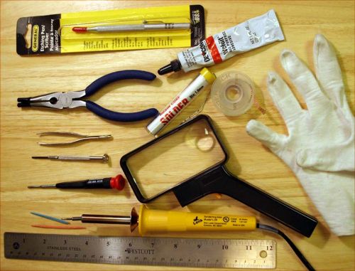 【工具包括】:钢板尺,25瓦尖嘴电烙铁,放大镜,一字螺丝刀,镊子,尖嘴钳,焊料,棉手套,胶水,碳化钨切割笔,以及微纤维擦镜布