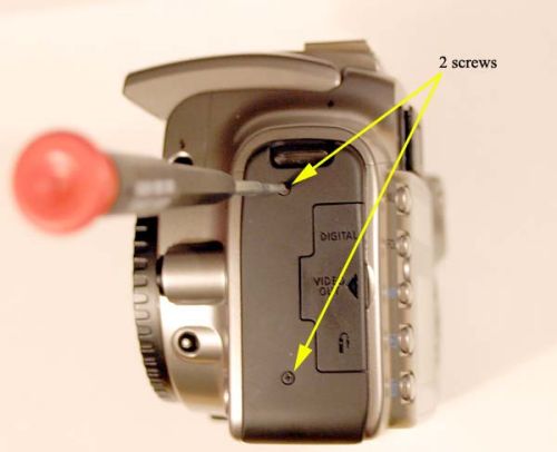2.4拆除机身侧面的两个螺丝。注意,上方背带扣处的螺丝长于下方的。