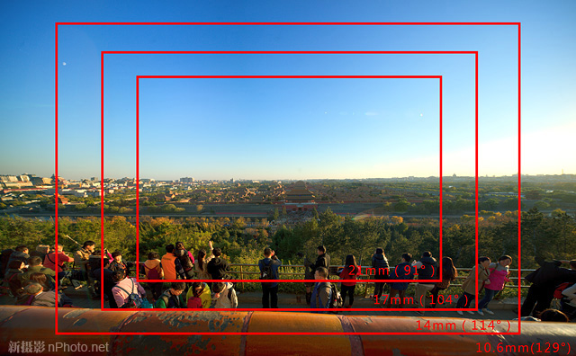 同时,细心的读者应该发现了,从21mm到17mm视角变化了13°,而从17mm到14mm视角变化了10°,但为什么感觉起来17mm到14mm的取景范围变化比21到17要大?实际上是由于超广角镜头都是由鱼眼镜头做基底,通过光学设计校正畸变而得到。在校正过程中就会产生这种边缘拉伸现象,当然也可作为超广角镜头的一种特点——所谓的“径向视觉冲击感”。21mm焦段几乎没有这种特性,17mm有一些但是不明显,14mm就很明显了。在这里实际上与视角比较相比,更好的方法是根据自己对这种冲击力的需求来选择相应焦段的镜头。有时候21mm相对平和的透视会获得效果更好的画面。