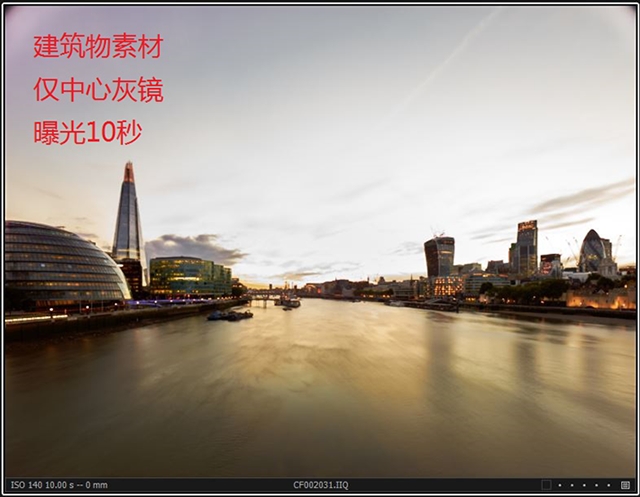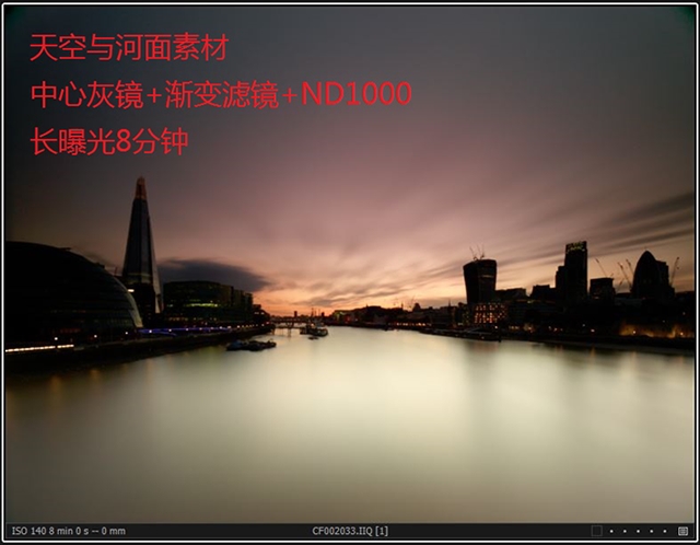 机位为伦敦塔桥拍摄泰晤士河试图长曝光日落阶段,包围曝光为先摘掉渐变滤镜与ND1000滤镜对建筑物正确曝光(10秒),然后装上渐变滤镜与ND1000滤镜对天空进行长曝光(8分钟)。