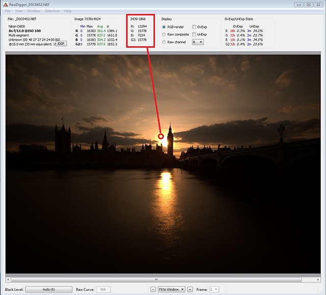 这样拍摄到的图,是严重欠曝的图,比剪影还黑,这对于传统器材以及传统拍摄手法来说就是拍了几十张废片,然而借助于现代数码后期技术以及现代传感器的优秀宽容度,这种“向左曝光”的拍摄手法却能够保留尽可能多的高光细节,且依然能取得很高的暗部信噪比。使用Raw Digger检查RAW文件(不是必备步骤)可以发现太阳附近的高光细节被保留下来,尽可能控制了高光溢出。