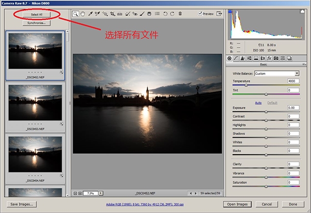 将这几十张图同时选中,拖拽进入Photoshop,会自动弹出ACR(Adobe Camera Raw)界面解RAW。点击左上角的“选择全部”选中所有RAW文件即可进行批量操作。这时候建议顺便对镜头进行色散矫正和暗角矫正、统一所有RAW的白平衡。
