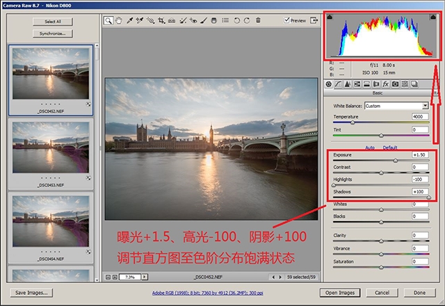 接下来的一步则是关键了:从RAW文件里尽可能多的恢复出来阴影细节与高光细节。不同的场景可能需要略微不同的前期曝光参数与后期调整参数,但是总体思路是一致的,就是采用如下这种“高光-100、阴影+100”的暴力方法,再借助曝光与对比度这几个选项调节,将直方图调节为色阶过渡丰富饱满的形状,理想的直方图形状请参考陈梦立 @陈梦立-香菜 的教程《我个人对色彩的理解》