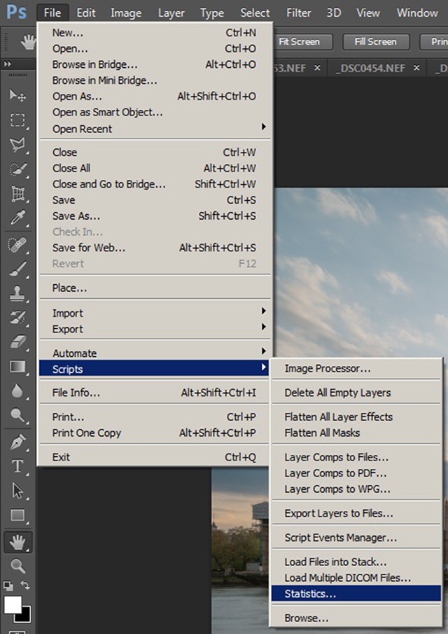 批量调节好直方图之后,就可以点击右下角的“打开照片”进入Photoshop了。取决于相机的像素以及电脑的配置,批量解几十张RAW会需要一定的时间,所有照片都在Photoshop里打开后,点击“文件”菜单,选择“脚本”,点击“统计”。(注意这个功能需要完整版/扩展版的Photoshop才有。)