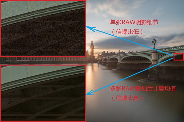而这里面最大的收获是提升了照片的信噪比——具体效果可以参见照片里的暗部100%细节,单张照片的阴影是有很多噪点的,而几十张照片叠加后的阴影则几乎不可见噪点了!这实际上就是利用了多帧降噪的原理,随机的噪音被多次曝光给匀掉了。这在天文摄影里是非常普遍的手法,可以取得更高的信噪比以及更高的宽容度。