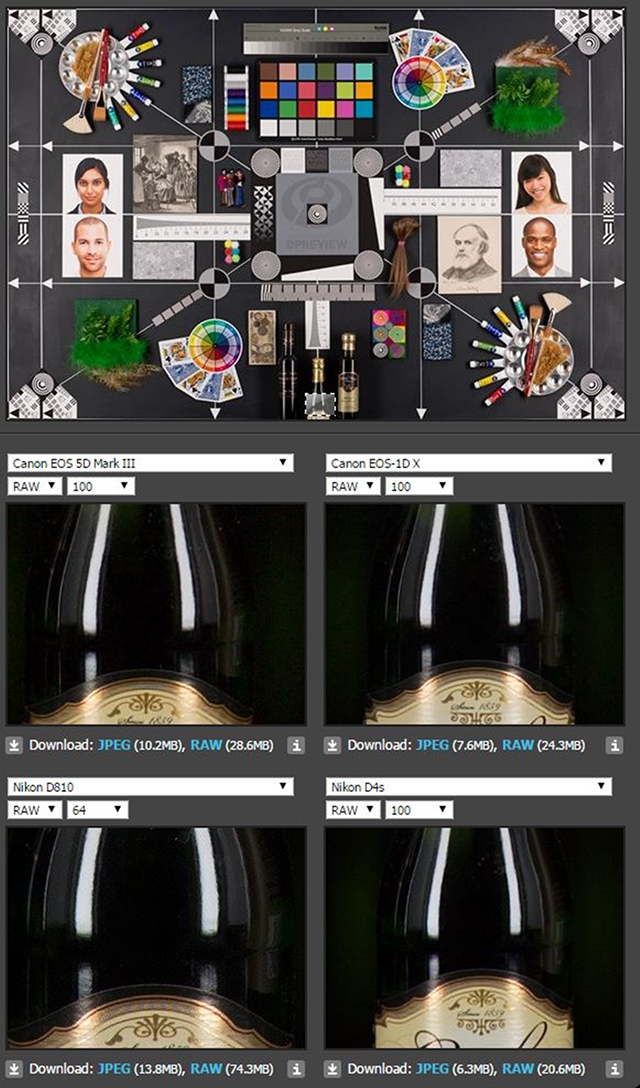 实际上笔者使用过2014年年初在售的几乎所有旗舰数码相机,包括佳能尼康索尼的135画幅相机和飞思的中画幅数码后背,稍后会提供笔者拍到的部分RAW文件的下载链接供感兴趣的朋友分析。不过笔者还是打算以中立实验室的可控变量测试得到的RAW文件说起。以2014年在售器材为例,我们先比较分析较为流行的佳能尼康旗舰机身宽容度(1DX、5D3、D4S、D810)。RAW文件来源自DPReview的基准测试棚拍,这种同场景同构图的公平对比最能够得到相对科学的结论,大家感兴趣可以前去自行下载。