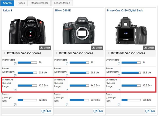 其实对于传感器宽容度的定量分析,DxOMark早就有做过,只是众多摄影师对其嗤之以鼻,认为其冷冰冰的数据并不能与摄影师的照片内容所发掘的真善美有任何相关性,或者认为DxOMark的测试结果是暴力粉尼康和索尼、暴力黑佳能,甚至有不少朋友认为D800E在DxOMark的宽容度跑分超越了飞思中画幅数码后背非?;拿?。事实上笔者耗费了很多的心力折腾了一圈的数码后背器材走了很多弯路,才发现自己的测试结果和DxOMark的数据是相符的。DxOMark将宽容度(Dynamic Range)分数又称作风光(Landscape)分数,其实也印证了DxOMark的看法亦是:对于风光摄影而言,画质是受限于宽容度的。
