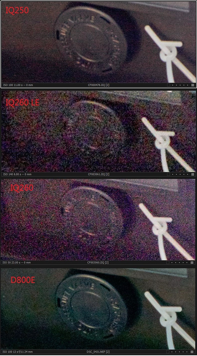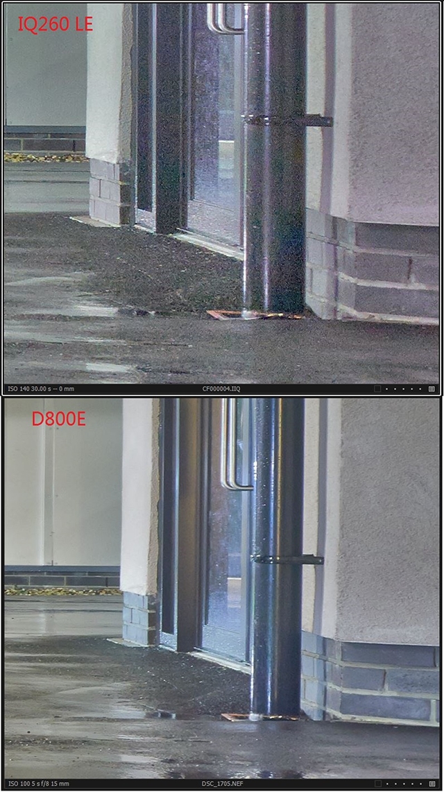 那么D800E在同样的条件下表现如何呢?以下为笔者亲自拍摄的D800E+24mm f/1.4G与IQ250/IQ260+40HR的严重欠曝对比(RAW文件下载地址),可以看到D800E的阴影信噪比惊人的高,远远的超越了IQ260(所以更是比IQ280强),与IQ250是同级别的水准。