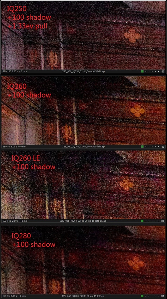 感谢龙壕@Bonnieazuresky让我有幸能用数码后背搭积木!靠我的财力自然是不可能接触到这么多昂贵的器材来写评测了。首先带给大家的是长曝光时IQ280、IQ260与IQ250的阴影恢复能力对比,可以看到IQ280的阴影信噪比最低,在Capture One里默认的降噪涂抹最狠,剩余细节最少,而IQ250这个残副CMOS则是明显的胜过两个645画幅的CCD。