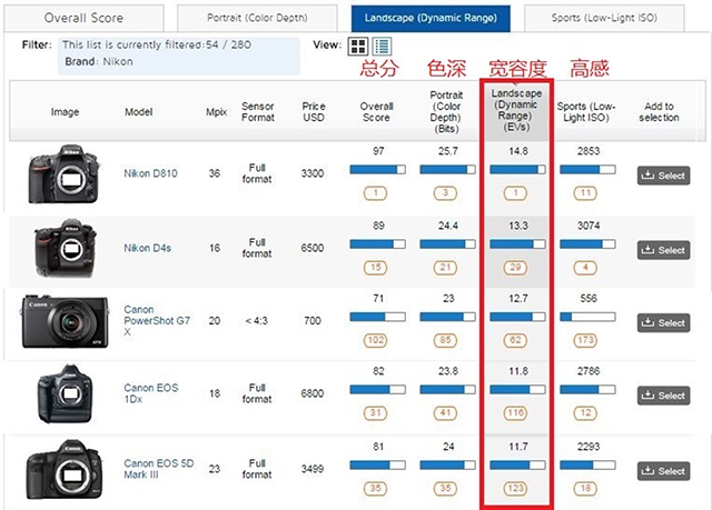 至于佳能的传感器,自2008年以来就一直落后于索尼的传感器,最为戏剧性的是旗舰全幅机身的宽容度竟然敌不过卡片机——佳能目前宽容度最强的相机竟然是唯一一台疑似使用了索尼传感器的机器!不少用户质疑DxOMark的数据缺乏公正性,然而事实上还有不少第三方网站也反映出佳能传感器在宽容度上的落后: