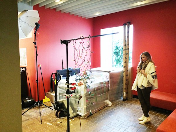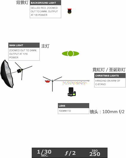大致灯光布局如上图,首先在摄影师左侧准备一个主灯给人物补光,其次是背景光,最后才是本文主体彩灯。借助一套脚架横杆,把彩灯带稀稀拉拉地挂上去,制造出一个灯帘的效果。灯帘别太密,否则画面会被灯挡住。然后用中长焦大光圈镜头透过灯帘就可以拍到顶图的效果了。