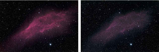 由于通常的数码单反相机是为人像和风景摄影而设计,为了优化此类场景的色彩还原而抑制了红色可见光范围附近的透光率。因此,使用这些相机拍摄来自星云和星系的带有H-α射线的图像时,常常照片颜色偏淡。为了解决此问题,D810A在影像传感器的前方采用了IR-cut光学滤镜,使H-α射线透光率相对D810同比高约4倍。这样便能获得令发射红光的星云和星系呈现鲜艳红色的天文照片。