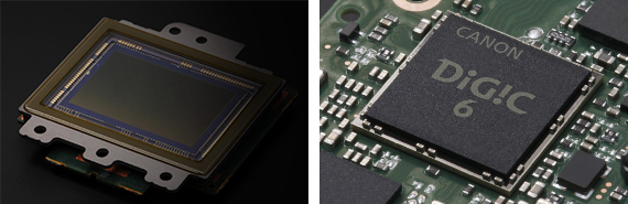左:佳能约2420万有效像素CMOS图像感应器,右:佳能DIGIC 6 数字影像处理器