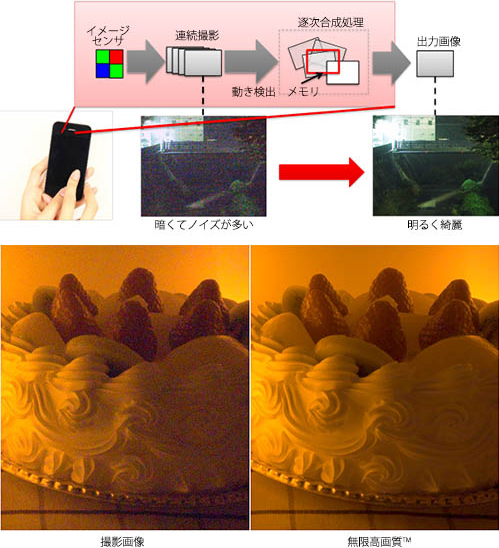 “无限高画质 ”利用东芝自行研发的高精度位移检测技术,结合高速连拍和电子防抖功能,采取多图叠加的方式获得与大尺寸传感器相似的高感光度表现。根据东芝公布的技术数据,使用1300万像素手机摄像头拍摄16张图像合成叠加,即可获得与普通APS-C传感器相同的信噪比表现(25dB)。该技术最多可使用约60张图像。