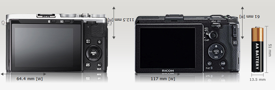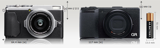 本次推出的X70在体积上与GR相差不多,从下面对比图看,正面两者相差不大,因为X70采用的是不可伸缩式镜头,所以X70较GR机身稍厚,但带来的好处是,富士X70比采用伸缩镜头方式的GR更坚固一些。在操控方面,X70带有手动光圈环,类似于X100,同时采用机顶双拨轮设计,其更适合双手操控,而成名已久的GR在单手操控方面可能会更强一些。