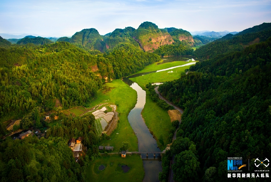 在新华网无人机的镜头下,江西抚州广昌丹霞地貌的绿水青山、远处几户人家、山间一片草地,渲染出一幅人与自然和谐相处的画卷。新华网杨益民摄 飞手 江远宾