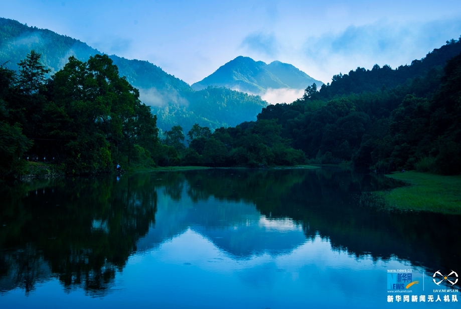 在新华网无人机的镜头下,江西抚州广昌丹霞地貌的绿水青山、远处几户人家、山间一片草地,渲染出一幅人与自然和谐相处的画卷。新华网杨益民摄 飞手 江远宾
