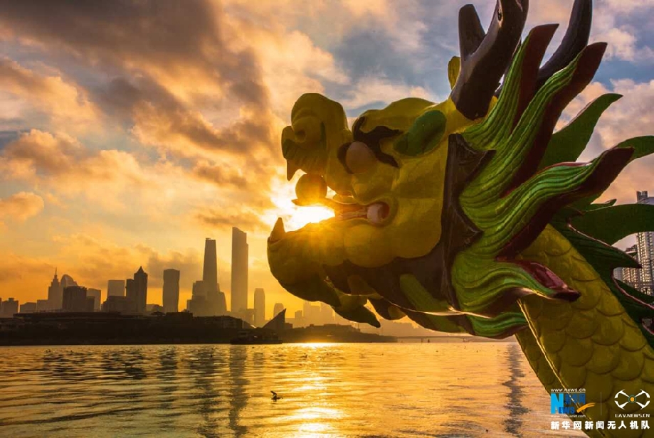 参赛龙舟在江边蓄势待发。新华网发 佘建新摄