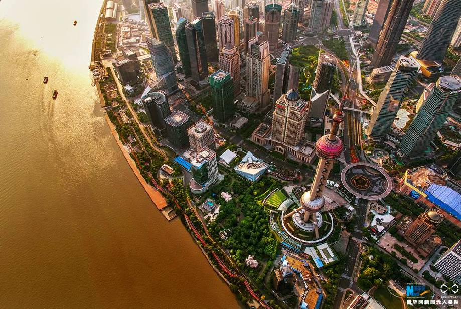 图为无人机航拍上海沿江美景,江水被镀上一层金黄。新华网发 王正坤 摄