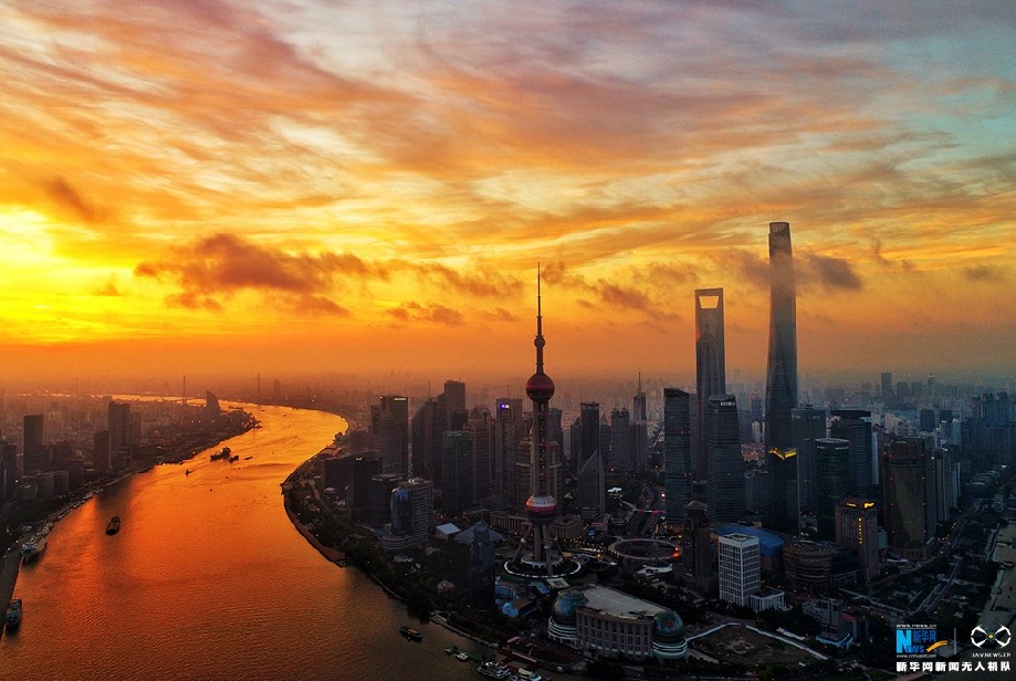 图为傍晚时刻的上海美景,云霞满天,江水静淌。新华网发 伍北海 摄