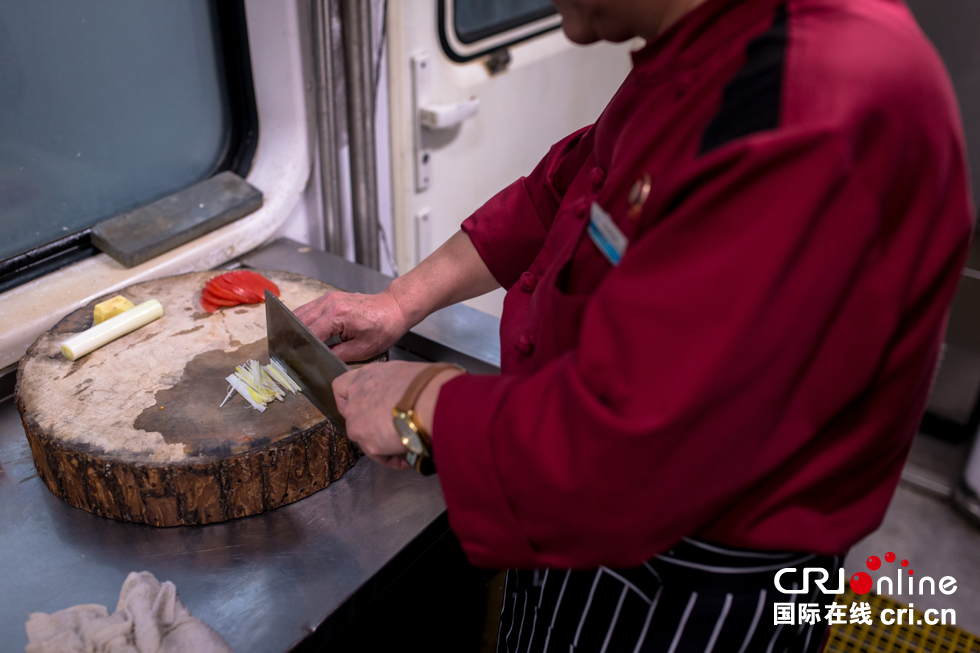 列车上的厨师和一般的餐厅厨师最大的区别在于“晃”,火车在运行中颠簸不断,“最重要的是腿要分开,站成外八字,扎好马步,随着车厢晃动的方向,这样才能稳当?!卑资Ω邓?。