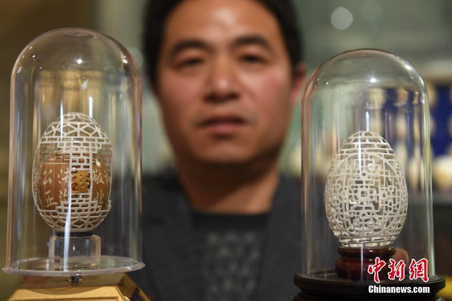 3月9日,董师傅展示“蛋中蛋”与镂空蛋雕作品。在浙江杭州,非遗传承人董一言凭借一把美工刀、一个空鸡蛋壳便能在仅有0.2毫米厚的方寸空间雕刻出图案来,将平淡无奇的蛋壳变为艺术品。中新社记者 王远 摄