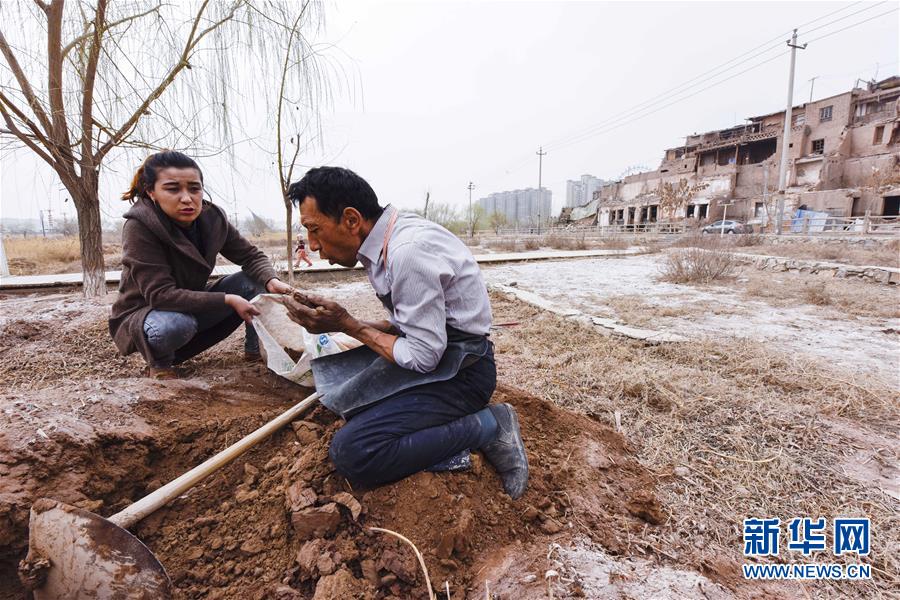吐尔逊·祖农与女儿依明罕·吐尔逊在老城边的吐曼河取土(3月14日摄)。新华社记者 赵戈 摄