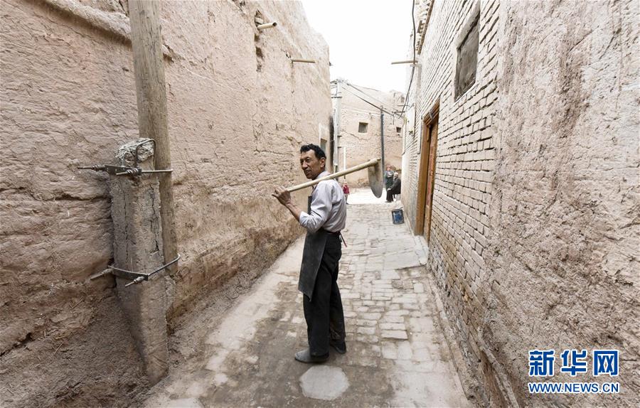 吐尔逊·祖农准备拿起工具去老城边的吐曼河取土(3月14日摄)。新华社记者 赵戈 摄
