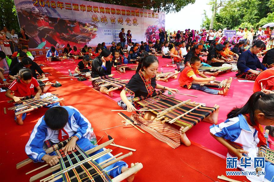 ????当日,海南省三亚市黎族苗族同胞欢聚一堂,进行黎锦、苗绣技艺竞赛等活动,迎接传统节日“三月三”。新华社发(陈文武 摄)