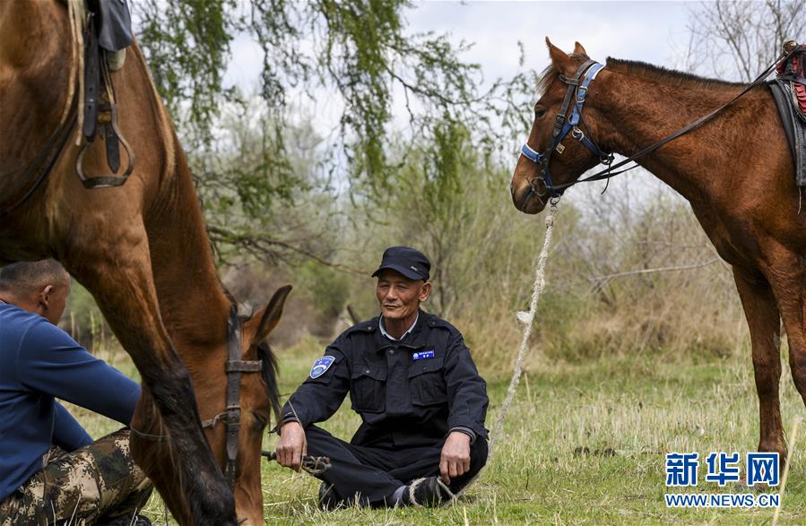 在新疆察布查尔锡伯自治县国家生态公益林种羊场片区,喀德尔江·厄勒哈木坚(右)在休息时与一名“马背护河队”队员聊天(4月19日摄)。新华社记者胡虎虎 摄