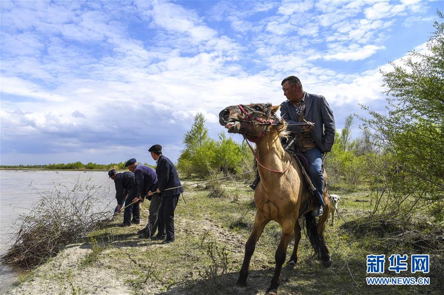 在新疆察布查尔锡伯自治县国家生态公益林种羊场片区,“马背护河队”队员哈纳皮亚·苏尔旦(右一)骑在马上协助其他队员将倒在伊犁河的枯树拉起(4月19日摄)。新华社记者胡虎虎 摄