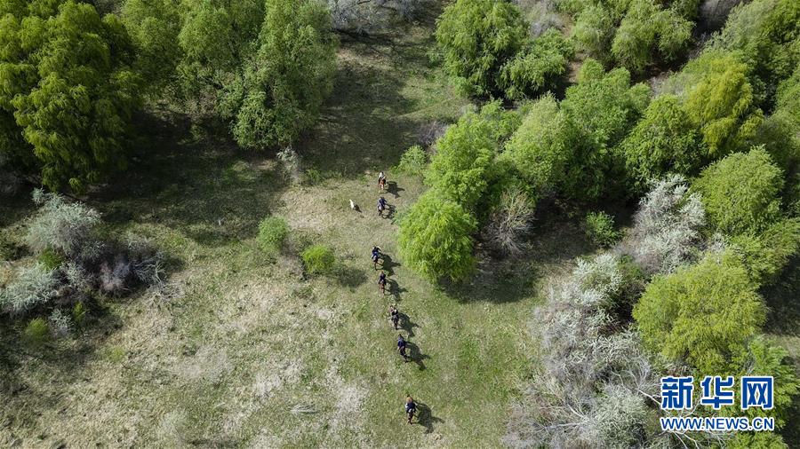 在新疆察布查尔锡伯自治县国家生态公益林种羊场片区,托海依村的“马背巡河队”在巡逻中(4月19日摄)。新华社记者胡虎虎 摄