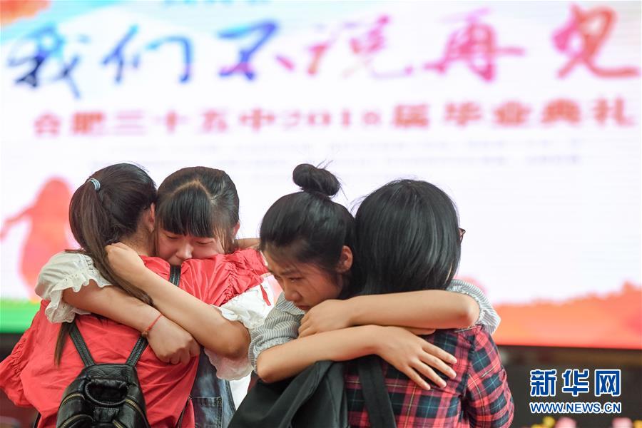 6月9日,合肥市第三十五中学的高三毕业生在毕业典礼上与老师拥抱。