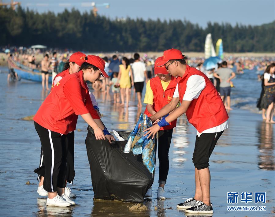 福建省东山县第二中学的环保志愿者在该县马銮湾清理海滩垃圾(2017年10月2日摄)。新华社记者 宋为伟 摄