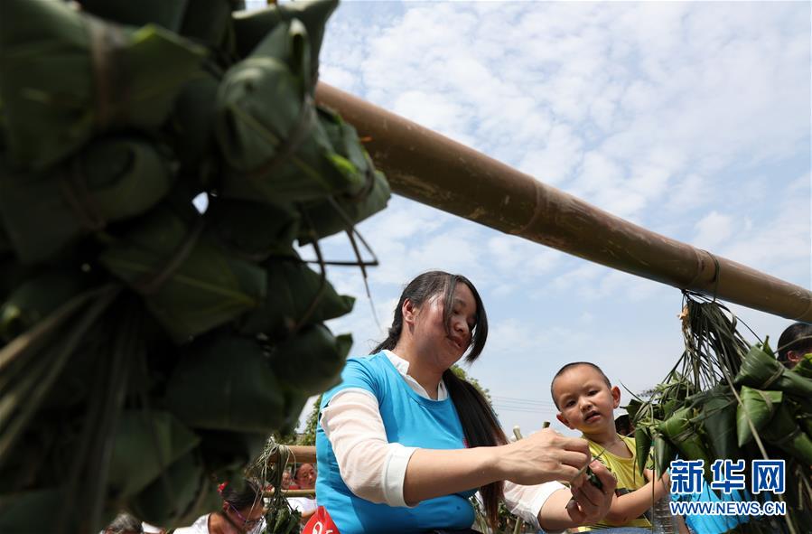 6月11日,在重庆市黔江区新华乡,一位女士带着孩子参加包粽子比赛。当日,重庆市黔江区新华乡举行包粽子比赛,当地居民比拼包粽子技艺,迎接端午节的到来。新华社发(杨敏 摄)