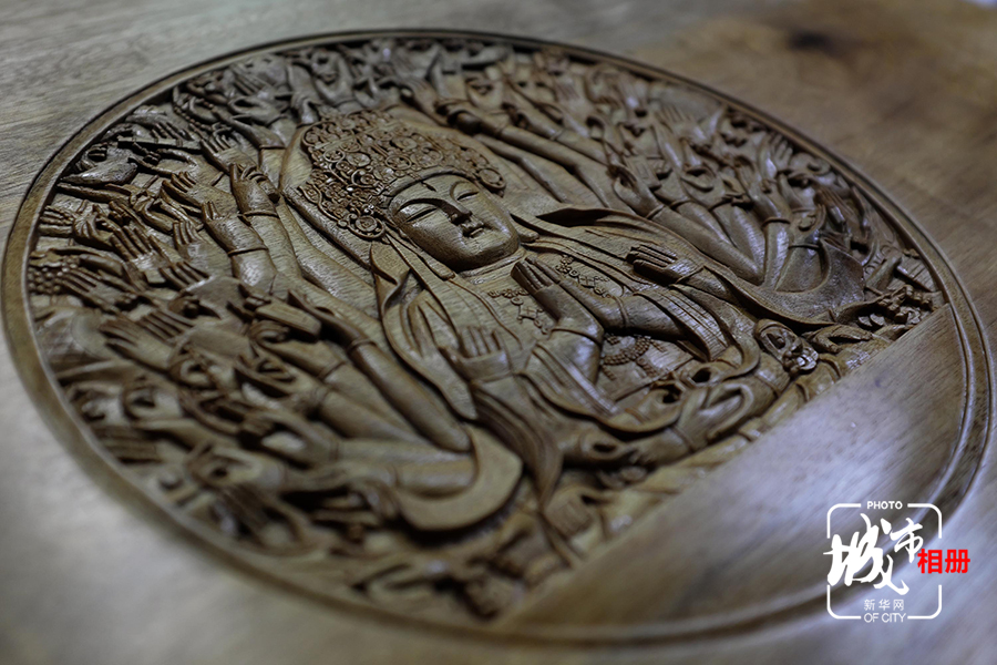 2016年开始,陈宝华开始了一项新的挑战,计划用15年的时间,完成一千个雕有大足石刻千手观音的木盒,用六毫米的深度,展现出千手观音的立体感。两年过去了,陈宝华和工匠们仅完成了百个,陈宝华希望,每完成一百个,雕刻的工艺都有新的突破。新华网李相博 摄