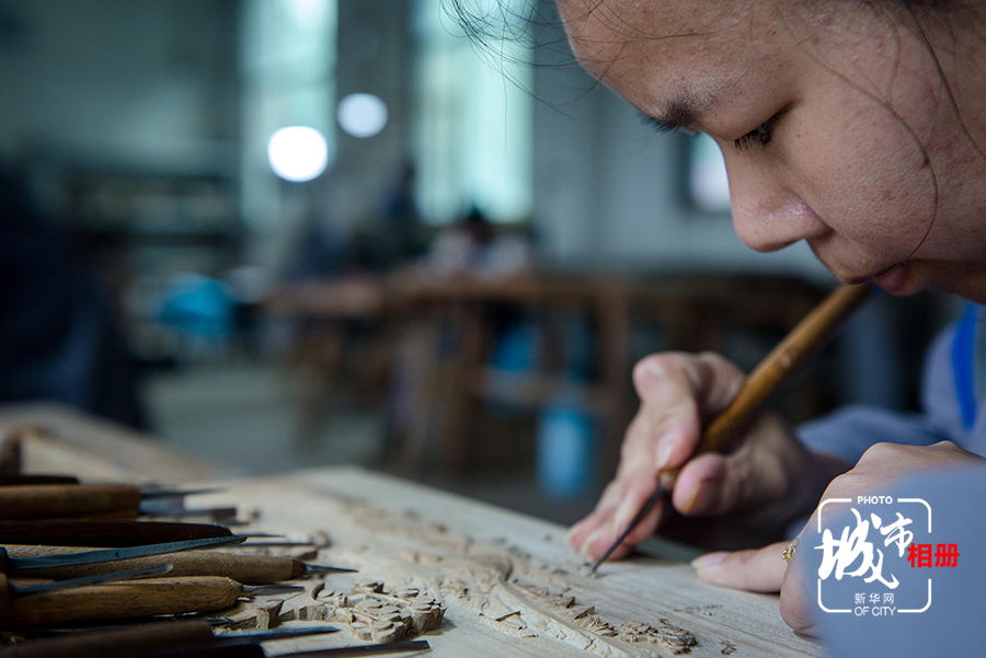 打坯完成后,稍有成型的木料便进入修光环节,相比打坯,修光步骤对手艺的要求更为细致,因此通常从事修光的,多为女工匠。新华网李相博 摄