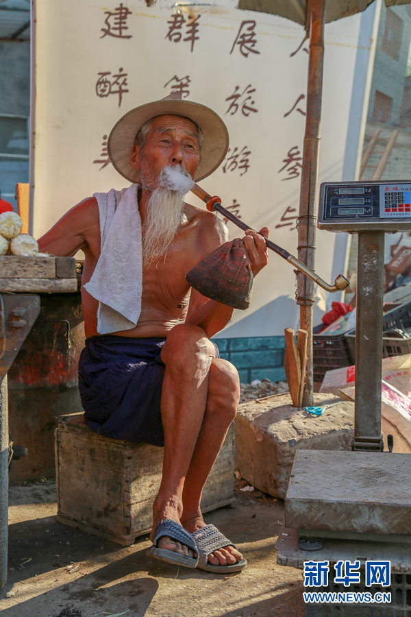 78岁的卖菜老人周大爷,每天上午9时前卖菜,9时后喝茶,天天如此。新华网发(李绪林 摄)