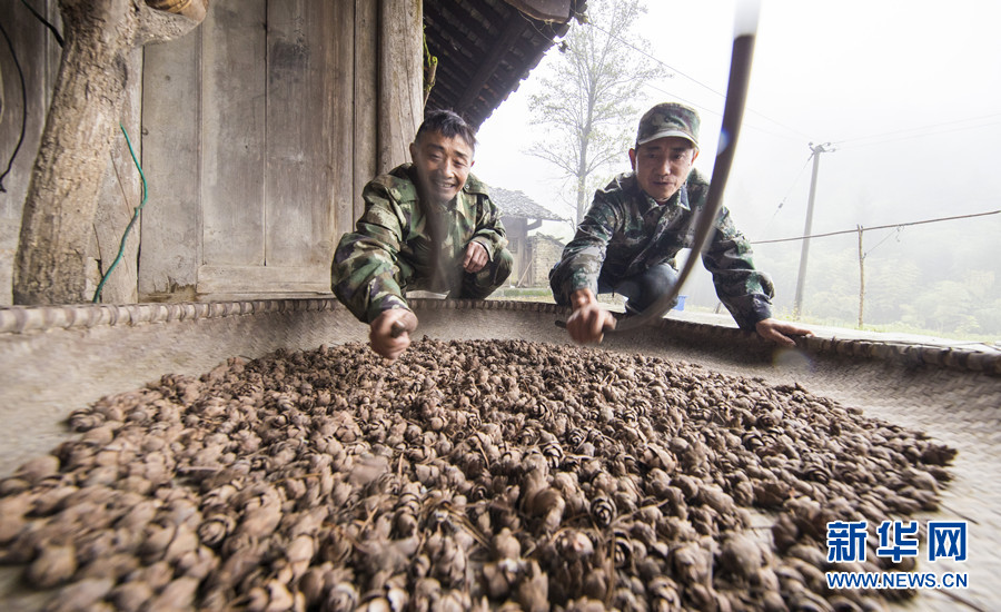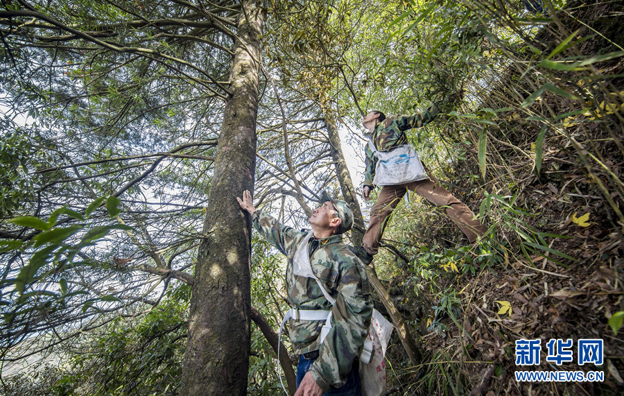 一个月下来,好的时候能采收到四五百个银杉果,稍差的时候只有百来个,甚至几十个。图为李光华(左)、李光禄(右)兄弟在收集银杉种子。新华网发(汪新摄)