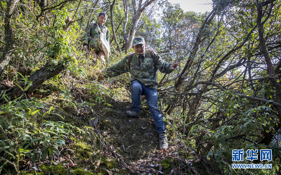 李家兄弟的日常工作,就是在密林找到银杉,给每株银杉编号、挂牌,定期巡查,掌握生长情况。金佛山是典型的喀斯特地貌,山上广袤平缓,四面却是几乎直立的陡峭悬崖。野生银杉一般长在山脊上,旁边就是万丈深渊。400多株银杉,平均每个月巡查一遍,至少得花10多天。人迹罕至的老林里很多地方都要弯着腰在荆棘中小心翼翼穿行。没有指南针等专业工具,全凭记忆和经验,走错路也是很常见的事情。新华网发(汪新摄)