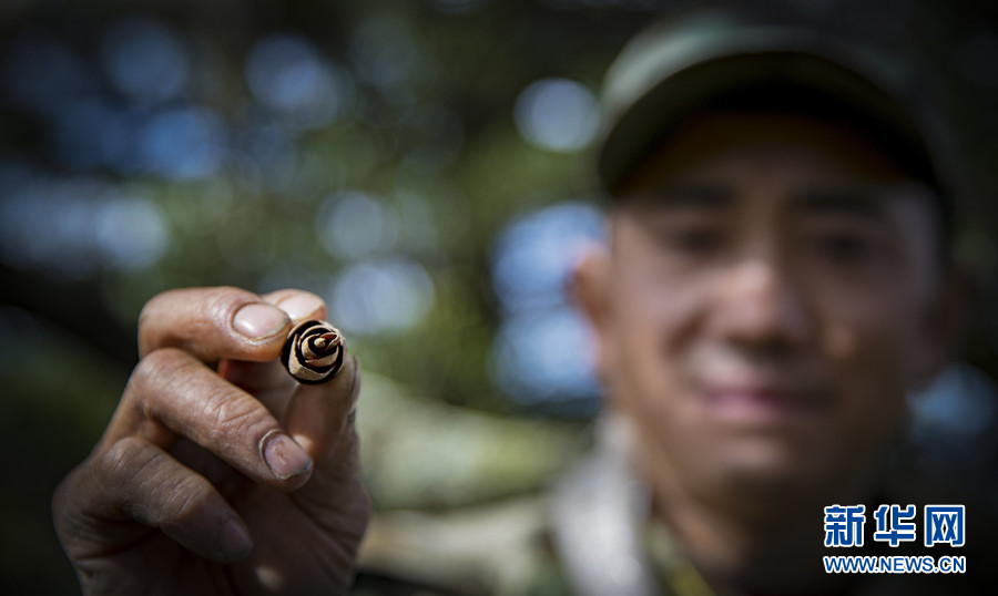 银杉籽是人工繁育银杉的基础。每年10月初成熟,成熟后的银杉果在树上只挂一个月左右,若在此期间未及时采摘,便会掉落无处可寻。采收时节,李家兄弟便穿着破旧的迷彩服,脚穿解放鞋,背上斜挎一个尼龙口袋,一棵一棵逐一采收。图中李光禄展示野生银杉果实。新华网发(汪新摄)